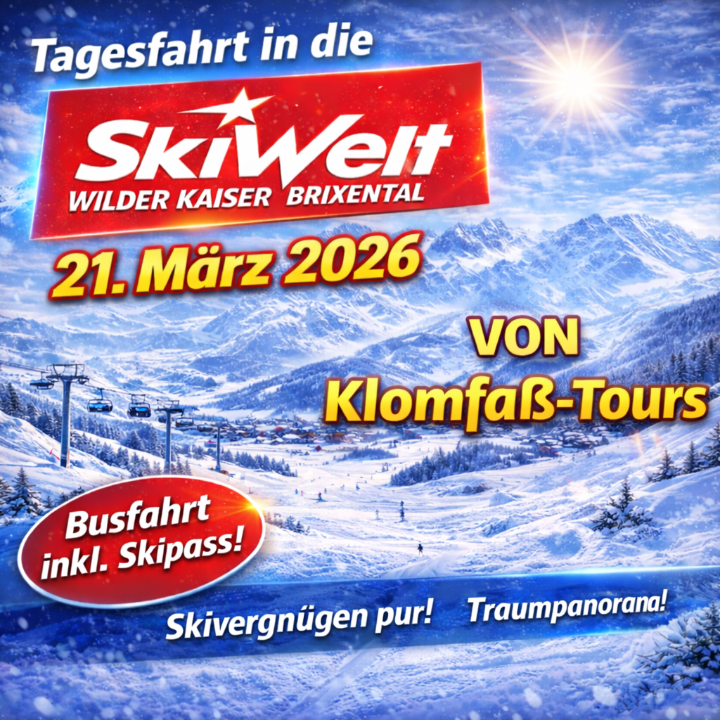 Am Samstag, den 21.03.2026, geht’s mit Klomfaß Tours auf Tagesfahrt in die SkiWelt Wilder Kaiser – Brixental! Euch erwartet eines der größten und abwechslungsreichsten Skigebiete Österreichs mit 275 Pistenkilometern, 81 modernen Liften/Bahnen und zahlreichen Einkehrmöglichkeiten in rund 80 Hütten – perfekt für alle Könnerstufen.
